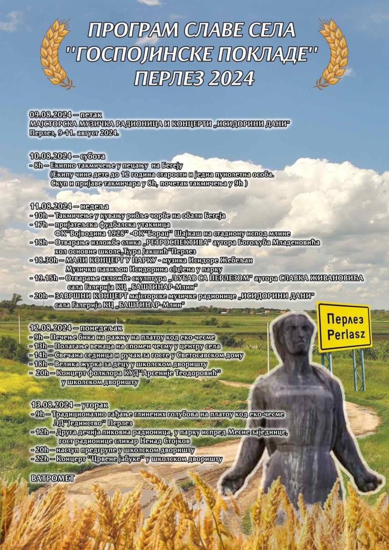 09:00 Tradicionalno gađanje glinenih golubova na platou kod eko-česme LD „Jedinstvo“ Perlez 12:00 Druga dečija likovna radionica, u parku ispred Mesne zajednice, gost radionice slikar Nenad Stoіkov 20:00 nastup predgrupe u školskom dvorištu 22:00 Koncert „Crvene jabuke“ u školskom dvorištu VATROMET